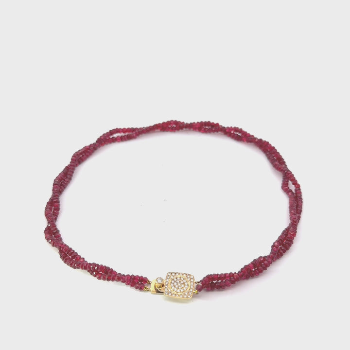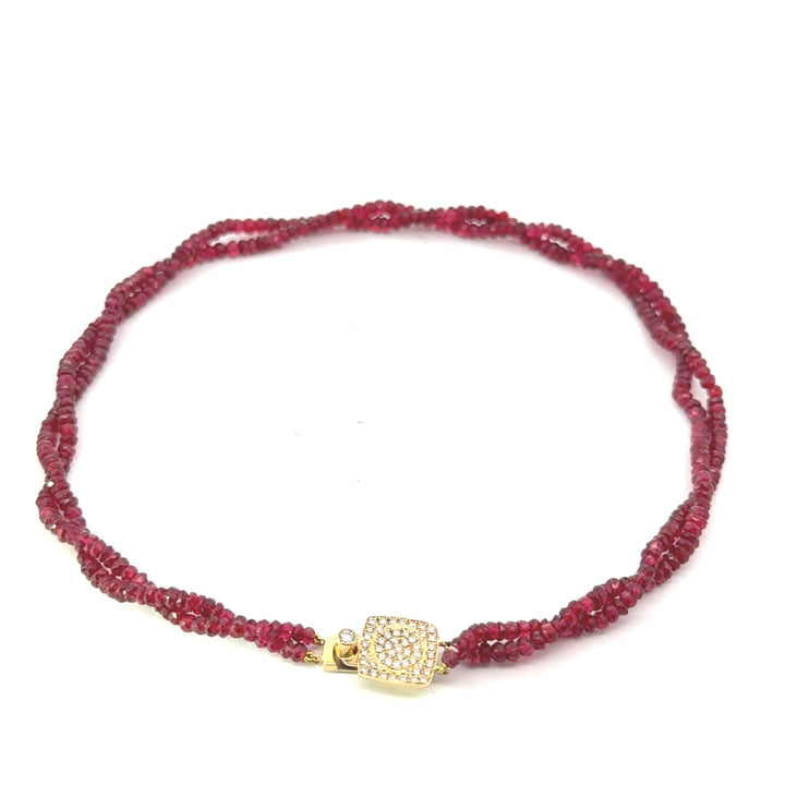 Ruby Beads, rich in depth and hue, meet a modern clasp of pavé-set diamonds.