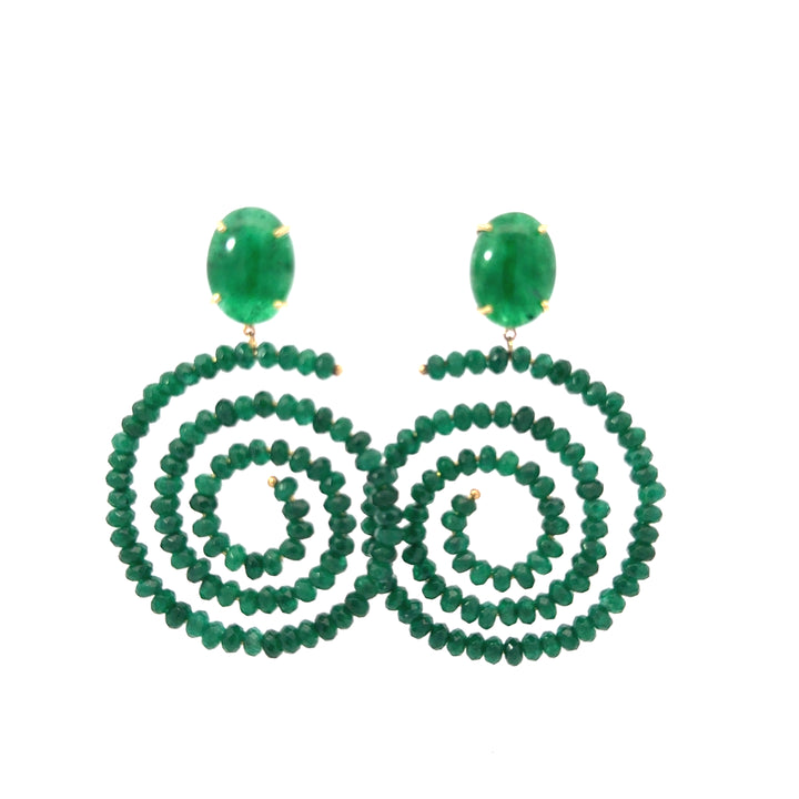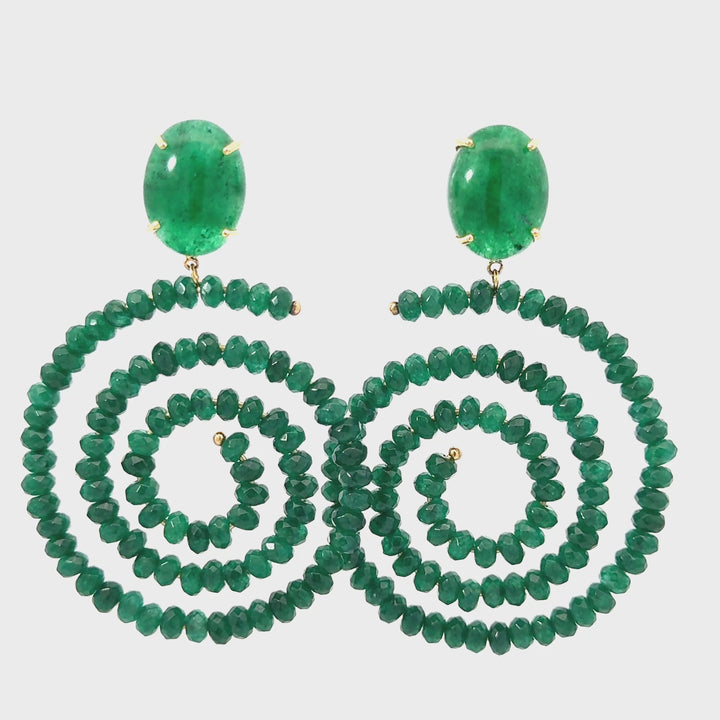 Multiple strands of finely faceted emerald beads form interlocking oval loops, moving with fluid precision. The composition is anchored by a polished green agate cabochon, seated directly against an 18k yellow gold base. Together, the elements create a striking balance-deep color, clean geometry, and elegant motion.
