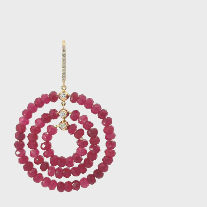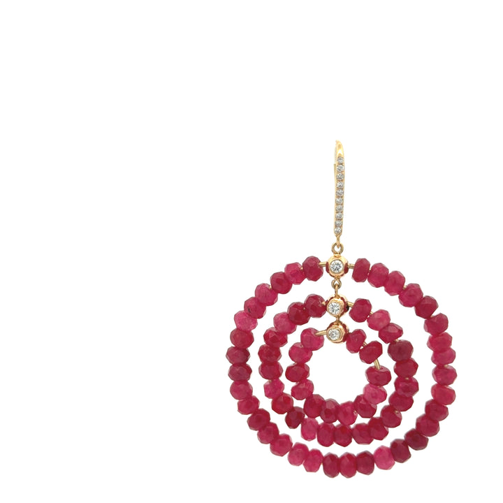 Concentric loops of faceted ruby beads are individually strung and suspended in layered alignment, creating a sense of constant, graceful movement. At the center, a trio of round brilliant diamonds is set in 18k yellow gold, adding a subtle focal glow.