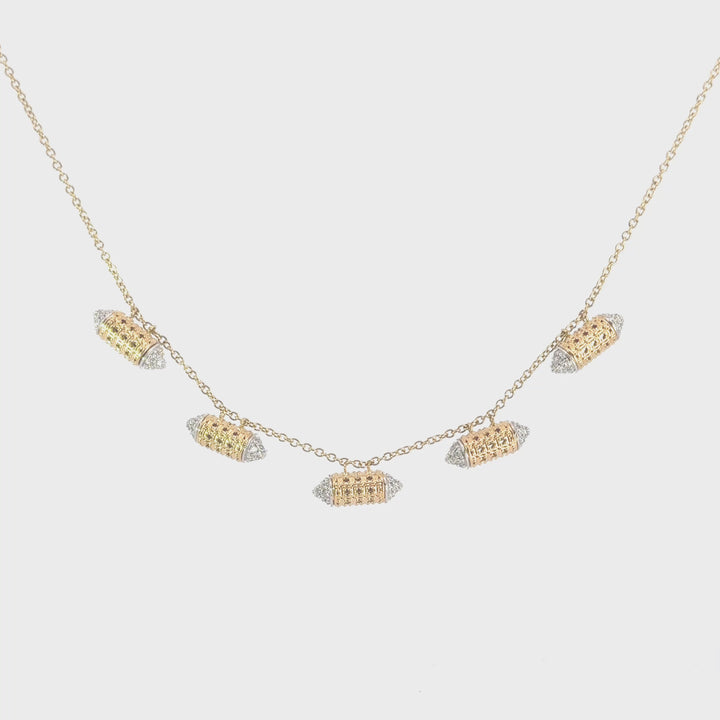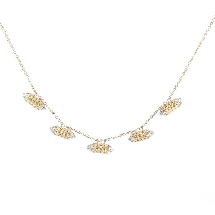 Five amulets float along the neckline, evenly spaced like protective talismans. Each piece speaks of continuity and calm, forming a graceful arc that rests with effortless poise.